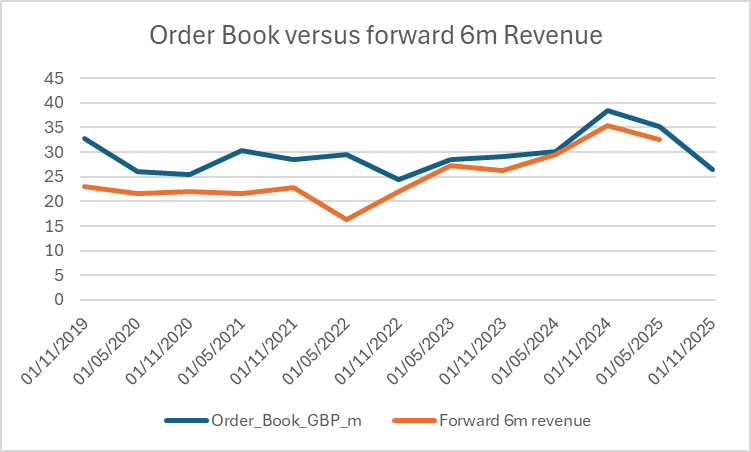 The forward 6m revenue has very closely matched the order book in recent times, and never exceeded it. So £26.5m order book versus a £70.5m FY revenue forecast makes it look like they will miss the FY revenue, unless they deliver significant sales pretty soon.